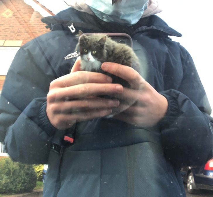 13. En katt hoppade in i min bil, och fönsterreflektionen ser ut som att jag håller i den.